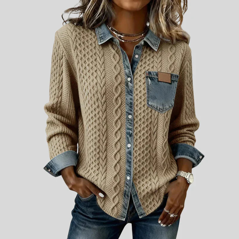 Denim Patchwork Shirt – Cable Knit Button-Up Casual Top for Everyday Wear