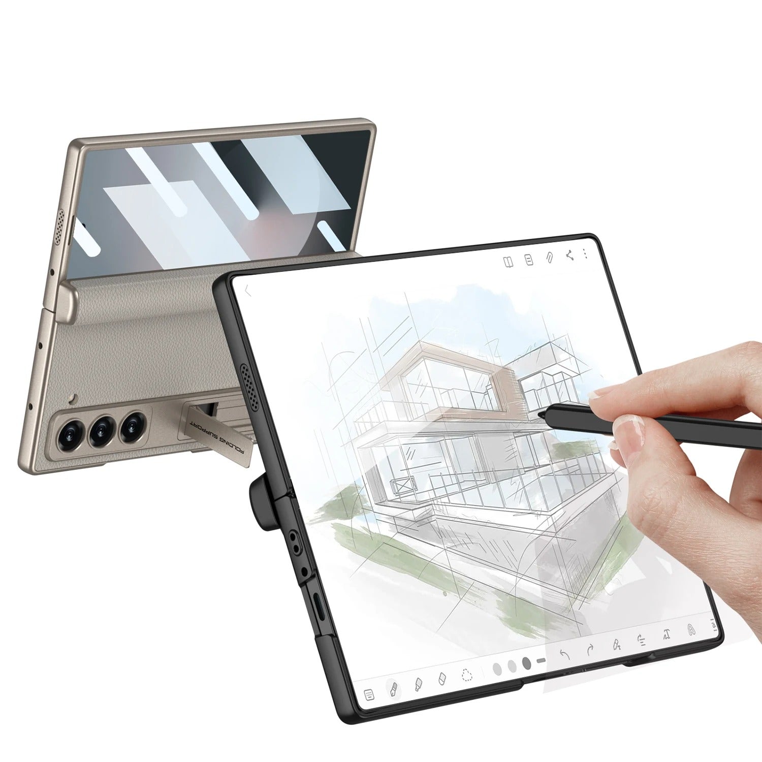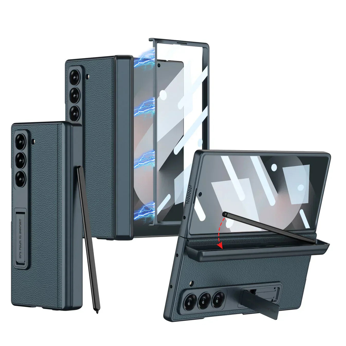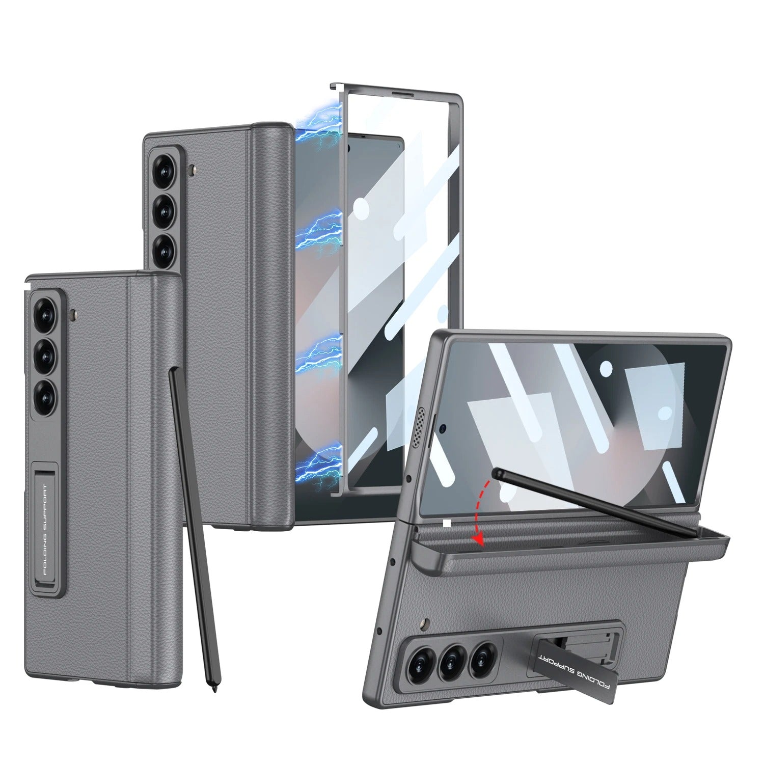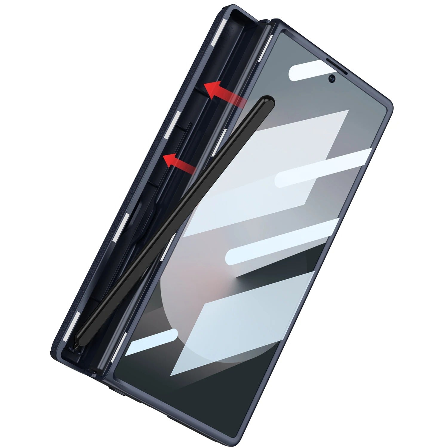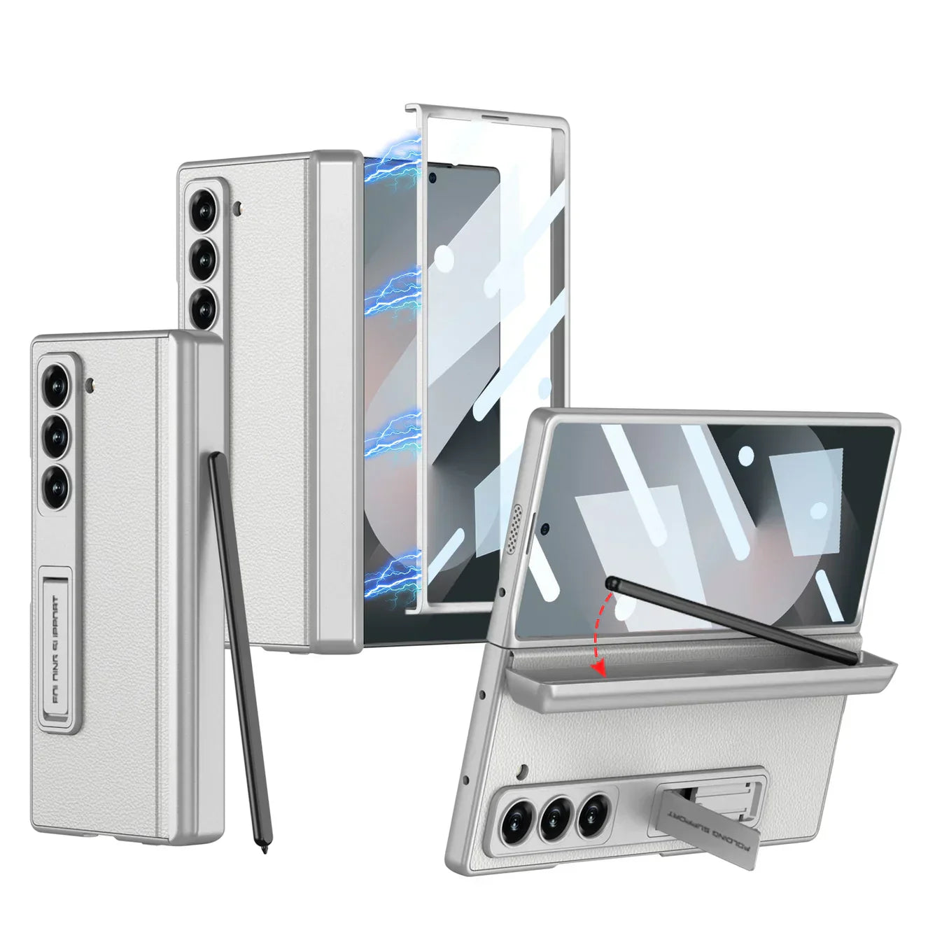 The Magneto® - Leather Pen Box Case with Screen Protector provides premium protection and versatile functionality for Samsung Galaxy Z Fold 7, 6, 5, 4, and 3. Made with high-quality leather, it features a magnetic pen box for secure stylus storage, shockproof design for durability, and an integrated screen glass protector for 360° device security. Ideal for both professional and everyday use.