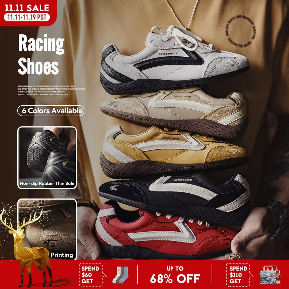 Discover the perfect blend of retro motorsport energy and modern streetwear comfort with the VELORUN™ Retro Racing Trainer. Inspired by classic track silhouettes and refined with sleek patchwork textures, these unisex sneakers deliver a lightweight feel, supportive fit, and a thin, non-slip sole designed for all-day wear.