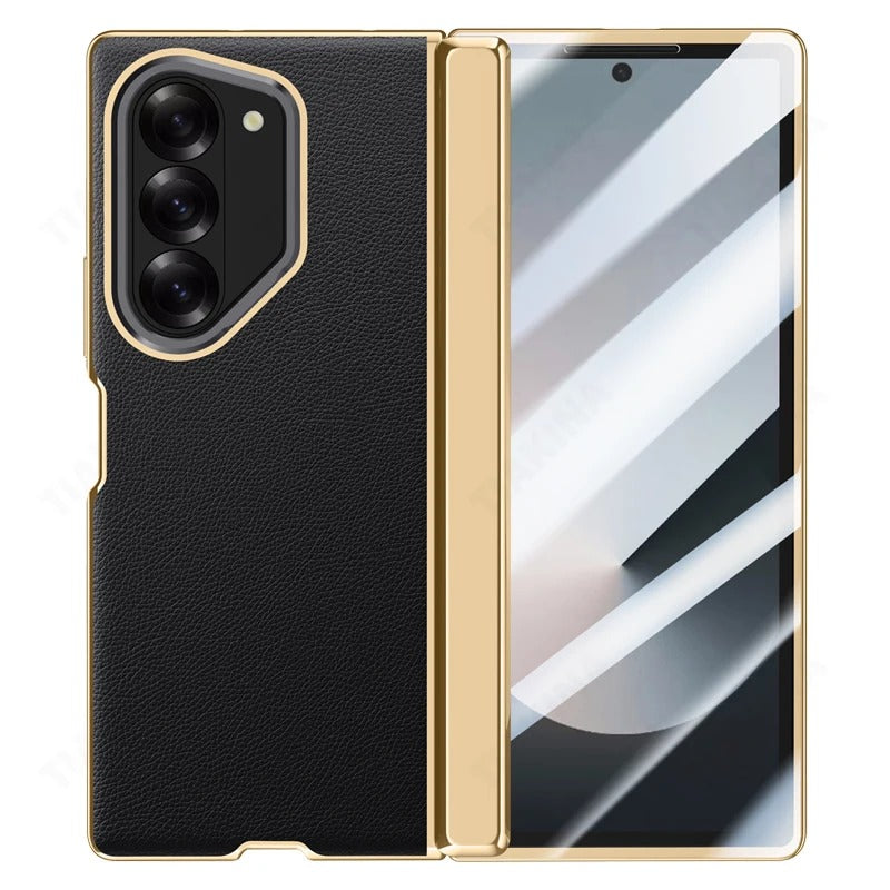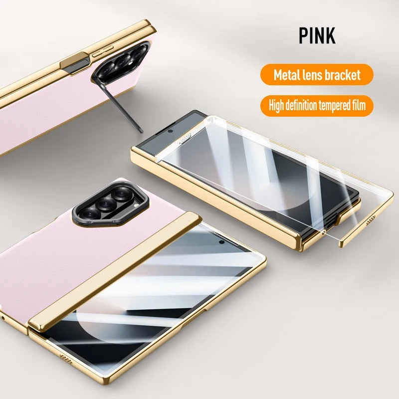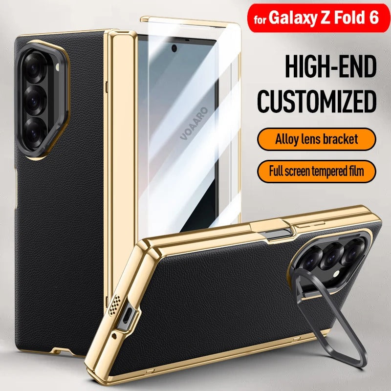 Luxurious Galaxy Z Fold 7 case with a golden frame, premium leather finish, hinge protection, and a built-in screen protector. Complete with a metal camera stand, this case combines elegance and full-body protection for your device.